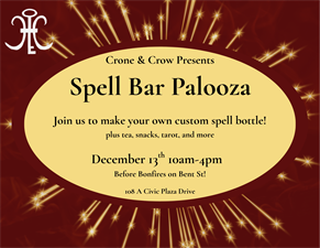Make your own custom spell bottle or pouch. Or just come hang out and drink tea with us before the bonfires start up on Bent Street!